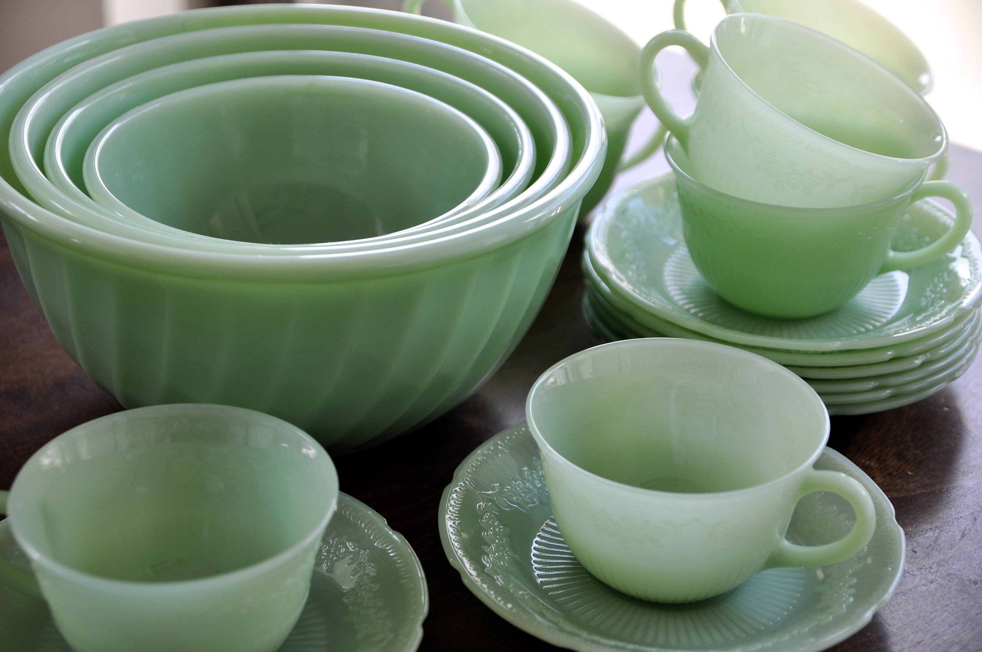 「ファイヤーキング」は1941~86年に米国アンカーホッキング社が製造したオーブン耐熱ガラス製食器のシリーズブランド名で、現在は生産されていません(他社製のライセンス品除く)。ぼってりとした形と「ミルクガラス」と呼ばれる色が特徴で、代表色は翡翠色をしたジェダイカラーです。