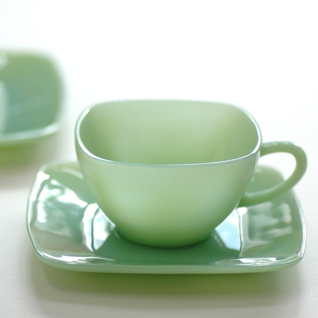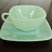 ファイヤーキングの中では一番古いシリーズのひとつ。ジェダイ=「Fire-King」=「オーブン耐熱ガラス」→オーブン調理が可能な食器を意味するためかカップに刻印が入るものと入らないものがあり(ジェーンレイやアリスも同様)刻印があるものは数が少ないです。1950年代に入ると全てのジェダイに刻印は入るようになりました。